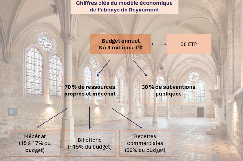 Ce modèle économique, distingue Royaumont d’autres monuments ou Centres culturels très dépendants des subventions (parfois jusqu’à 70 ou 80%). Il assure une relative stabilité, même si la crise sanitaire a temporairement bousculé cet équilibre. Les défis actuels concernent la baisse tendancielle des subventions et les limites à ne pas franchir : développer les recettes sans perdre la vocation culturelle et l’utilité publique de l’abbaye.